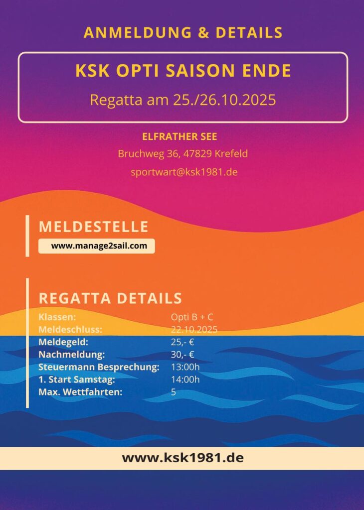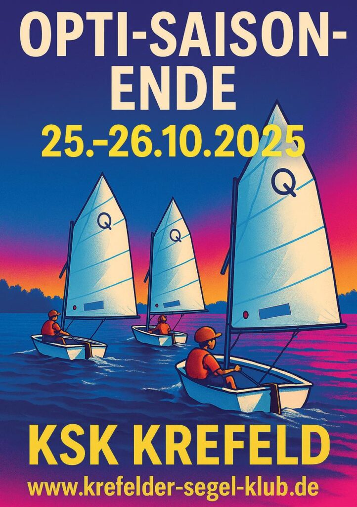 Ende der Segelsaison 2025: Der KSK lädt zur Opti-Regatta ein! Nachwuchsseglerinnen und -segler kämpfen um die letzten Platzierungen der Saison – ein Familien-Event mit spannenden Wettfahrten, guter Stimmung am Hafen, Verpflegung und Siegerehrung. Alle Informationen zur Anmeldung und zum Ablauf findet ihr auf unserer Website. Kommt vorbei, segelt mit oder feuert die jungen Segler an und feiert mit uns das Saisonfinale!